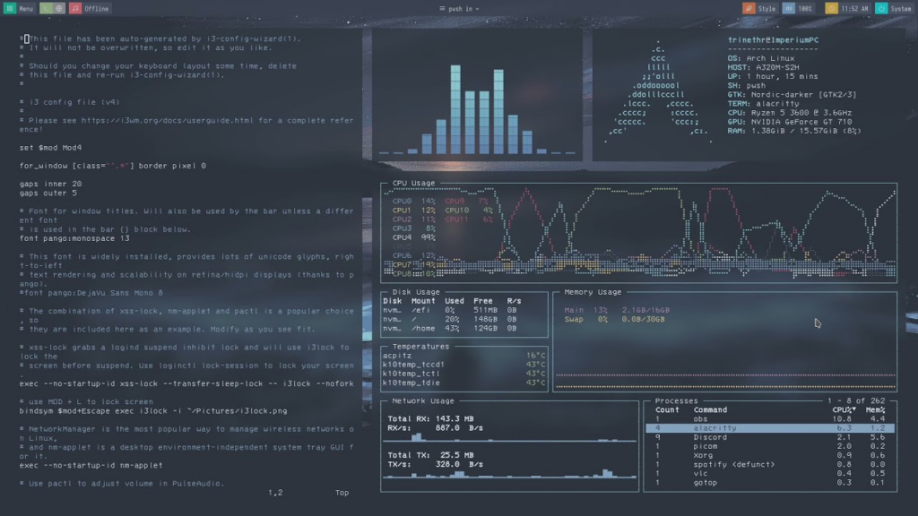 With all that stuff installed, we can go to config file: ~/.config/i3/config